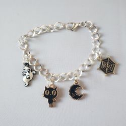 Retro 80s silver Halloween gold resin charm link chain bracelet black spider ๐ท web๐ธ black kitty cat๐ฑ ๐ white ghost ๐ป black crescent moon I can c$15Parsippany-troy Hills, NJ