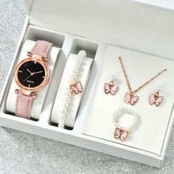 4 PCs Watch Set , Pink Watch With Gold Necklace Earrings Pearl Bracelet & Ring , Exclusive Deal Jewelry Set , Perfect For Women Gift $12New York, NY
