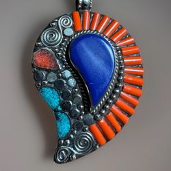 Exquisite Handcrafted Ethnic Tibetan & Navajo Style Silver Pendant Set In Lapis & Silver 3”inch & 45grams$35Queens, NY