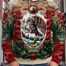 Mexican Eagle Emblem 3D Digital Print Hoodie - Casual Pullover with Pocket, 100% Polyester, Slight Stretch Knit Fabric, Hooded Long Sleeve Sweatshirt$20Queens, NY