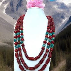 Vintage & Handmade Indo/Tibet Ethnic Style 3 Strand Necklace Set In Nepalese Coral & Turquoise 23”inch Long.$99The Bronx, NY