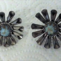 Vintage Flower Silver Tone Metal Turquoise Marble Center Earrings Screwback$10Hicksville, NY