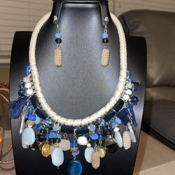 Costume Jewelry - Ivory Colored Rope-like Necklace w/ Multiple Blue & Tan Charms & Matching Earrings Set - Medium Length $14North Providence, RI