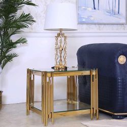 Square Glass End Table, 2-Tier Side Table with Clear Tempered Glass Top Golden Mirrored Stainless Steel Legs, Modern Luxury Nightstand Bedside Table w$60Irmo, SC