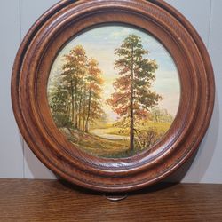 Vintage Unsigned Round Oil on Board Autumn Landscape Painting - Framed Birch Grove with Sunset Path, Mid-Century Folk Art$60Spring Hill, TN