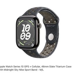 Apple Watch Series 10 GPS + Cellular, 46mm Slate Titanium Case with Midnight Sky Nike Sport Band - M$350Springville, UT