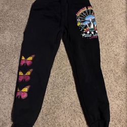 Black sweatpants with butterflies and mushroom designs$10North Fond Du Lac, WI