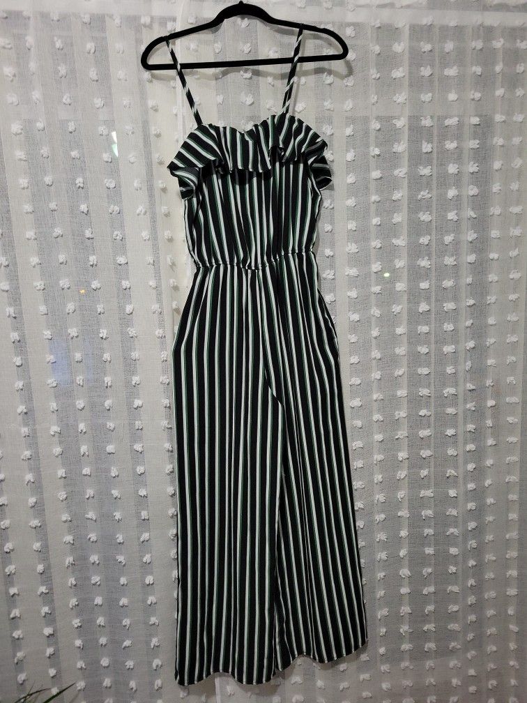 Trés cute! Striped romper with adjustable straps, lightweight fabric, and comfortable fit. Can be styled casually with white converse or dressed up with strappy heals. Fits small/medium