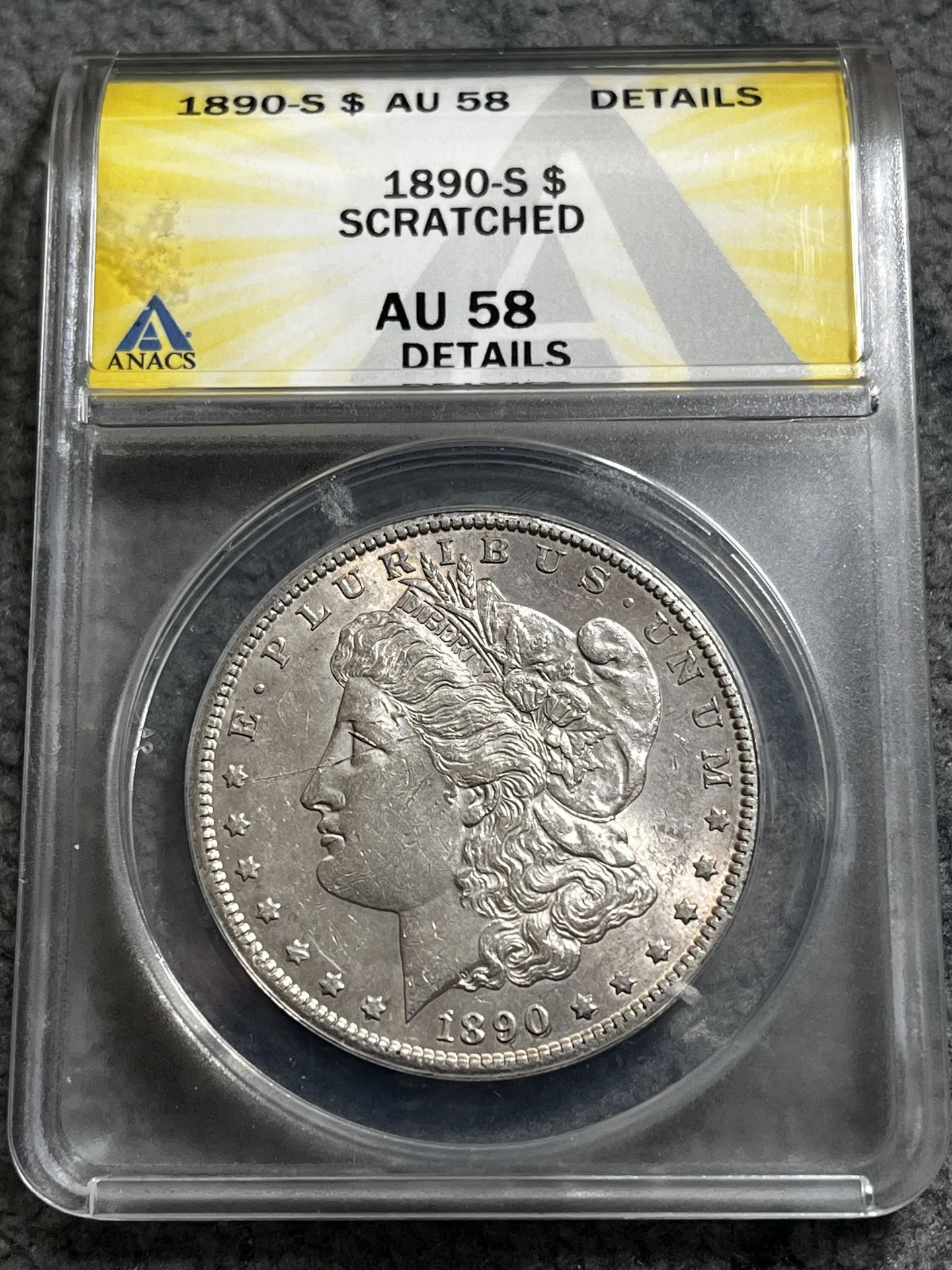 1890-S Morgan silver dollar from ANACS graded AU58 Scratched details. Sharp details and graded slab. Hayward area meet up please. No shipping.