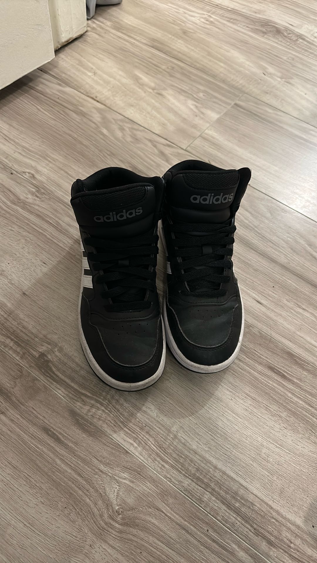 Black and white Adidas high top 3 1/2 youth size. Hardly worn he out grew them so fast.