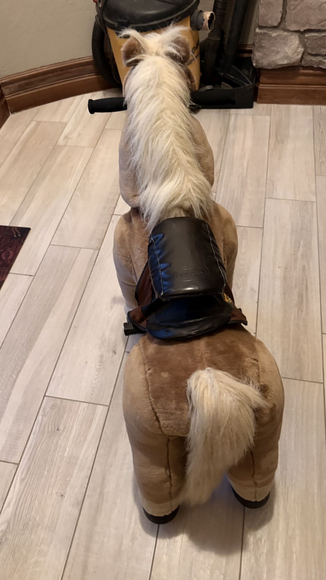 Giddy Up N Go Pony ride-on toy for kids. Plush horse that kids can actually ride—push the foot pedals and it moves forward with a realistic galloping motion. Way better than a rocking horse. • Brand: Giddy Up N Go Pony • Color: Brown with light mane & tail • Soft plush body • Foot-pedal riding motion (no batteries) • Sturdy and stable • Indoor use only Condition details: • Clean, no odors • Normal wear from use (see photos) • Mane, tail, saddle, reins, and handles all present