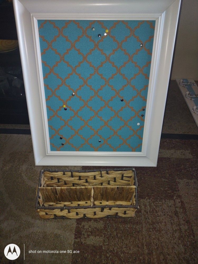 Office Items. Bright Turquoise Bulletin Board And Wicker Holder For Notebooks And Pens