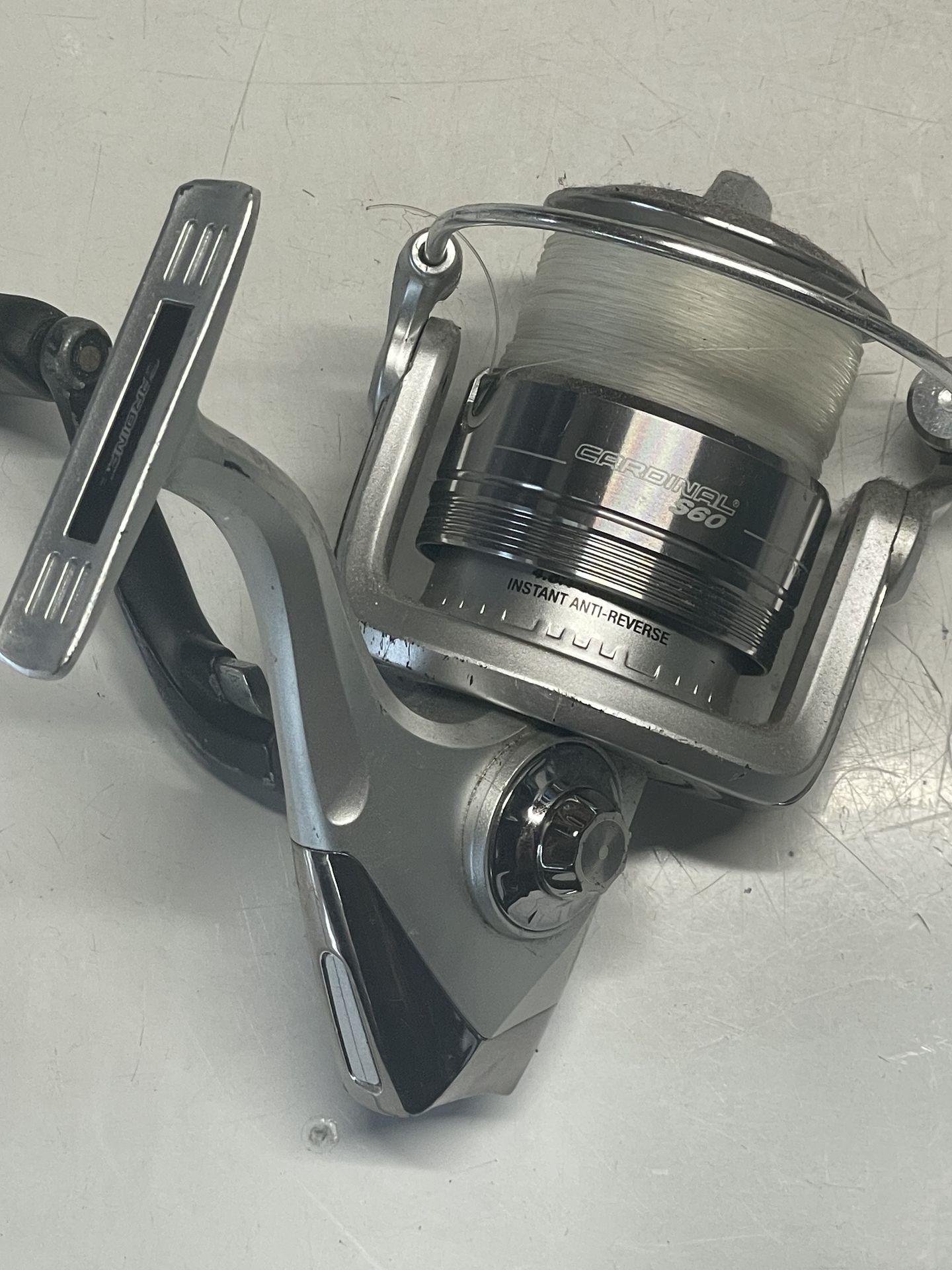 Abu Garcia Cardinal S60 Line capacity - Mono: 250yd/12lb, 205yd/14lb, 150/20 Braid: 220yd/0.25mm The reel crank arm is unoriginal to the reel, but works fine. Accepting Venmo or cash.