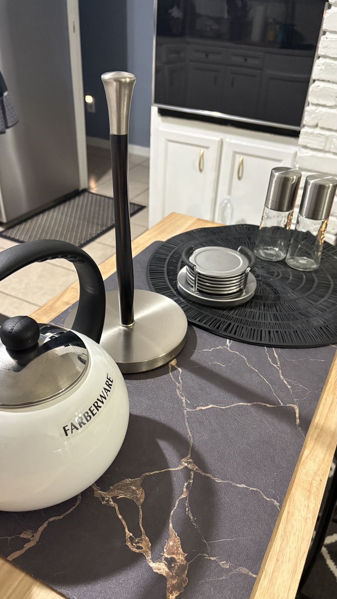 Dm if interested in buying anything separately and we’ll discuss the pricing. This bundle contains tea kettle, napkin holder, salt, and pepper shakers, coasters, 4 table place mats