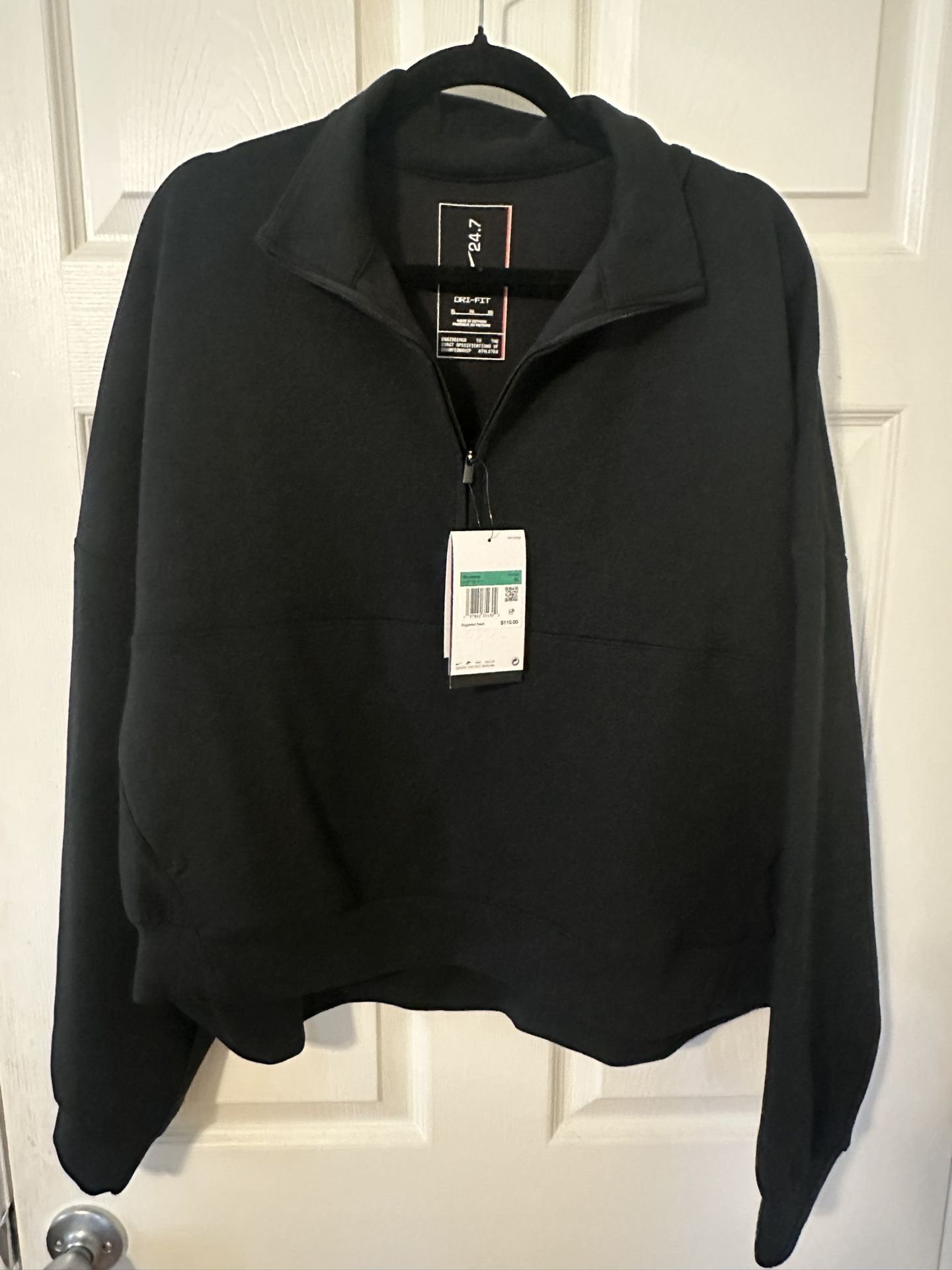 Nike 24.7 ImpossiblySoft Women's Dri-FIT Oversized 1/2-Zip Top Black Size XL Size & Fit Model is wearing size S and is 5′8″/173cm Oversized fit: exaggerated and spacious Fits large; we recommend ordering a size down