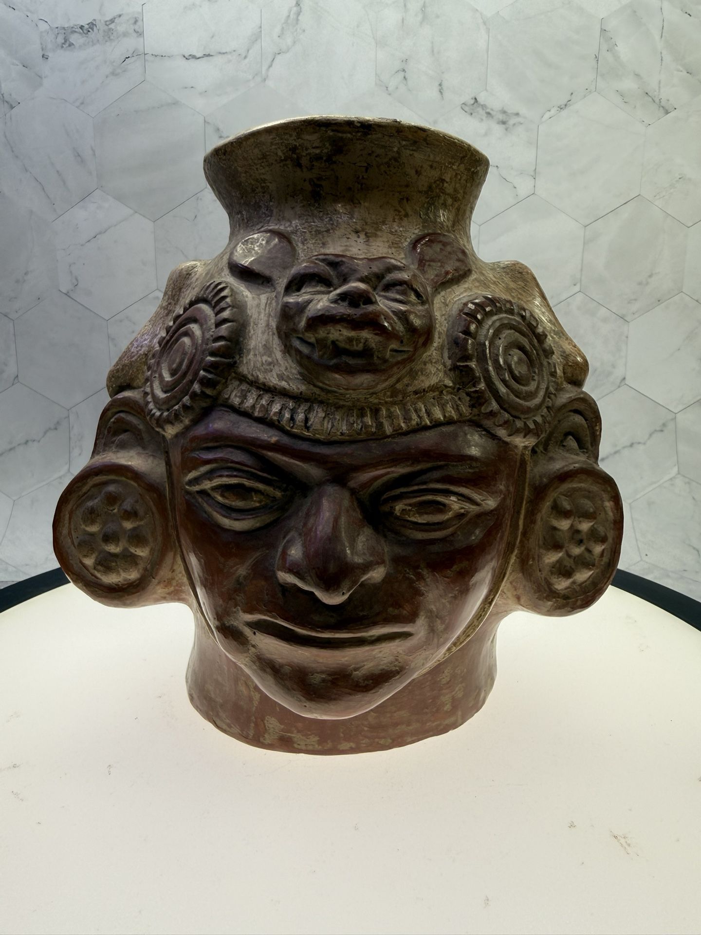Moche pottery portrait vessel from ancient Peru. Produced by the Moche civilization between 100 BCE and 800 CE. These vessels are highly realistic portrayals believed to represent specific, actual individuals from Moche society, often leaders or dignitaries. This example features a detailed facial expression, large ear spools, and a headdress adorned with a zoomorphic figure, likely a jaguar. Archaeologists believe they were used in daily life or ceremonial settings before being placed in tombs.