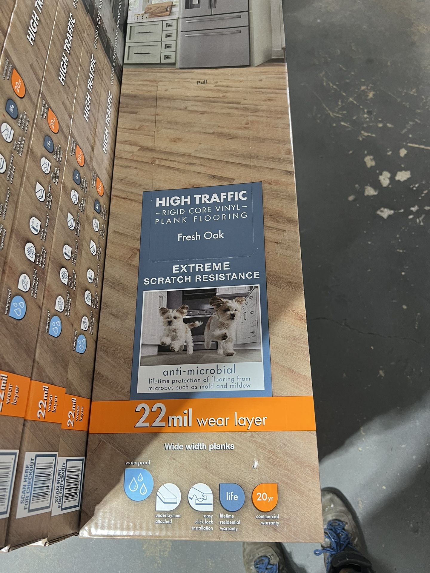 Hello I have 67 brand new boxes. Fresh Oak 22 MIL x 8.7 in. W x 48 in. L Click Lock Waterproof Luxury Vinyl Plank Flooring (20.1 sqft/case) PRICE $48 per box.