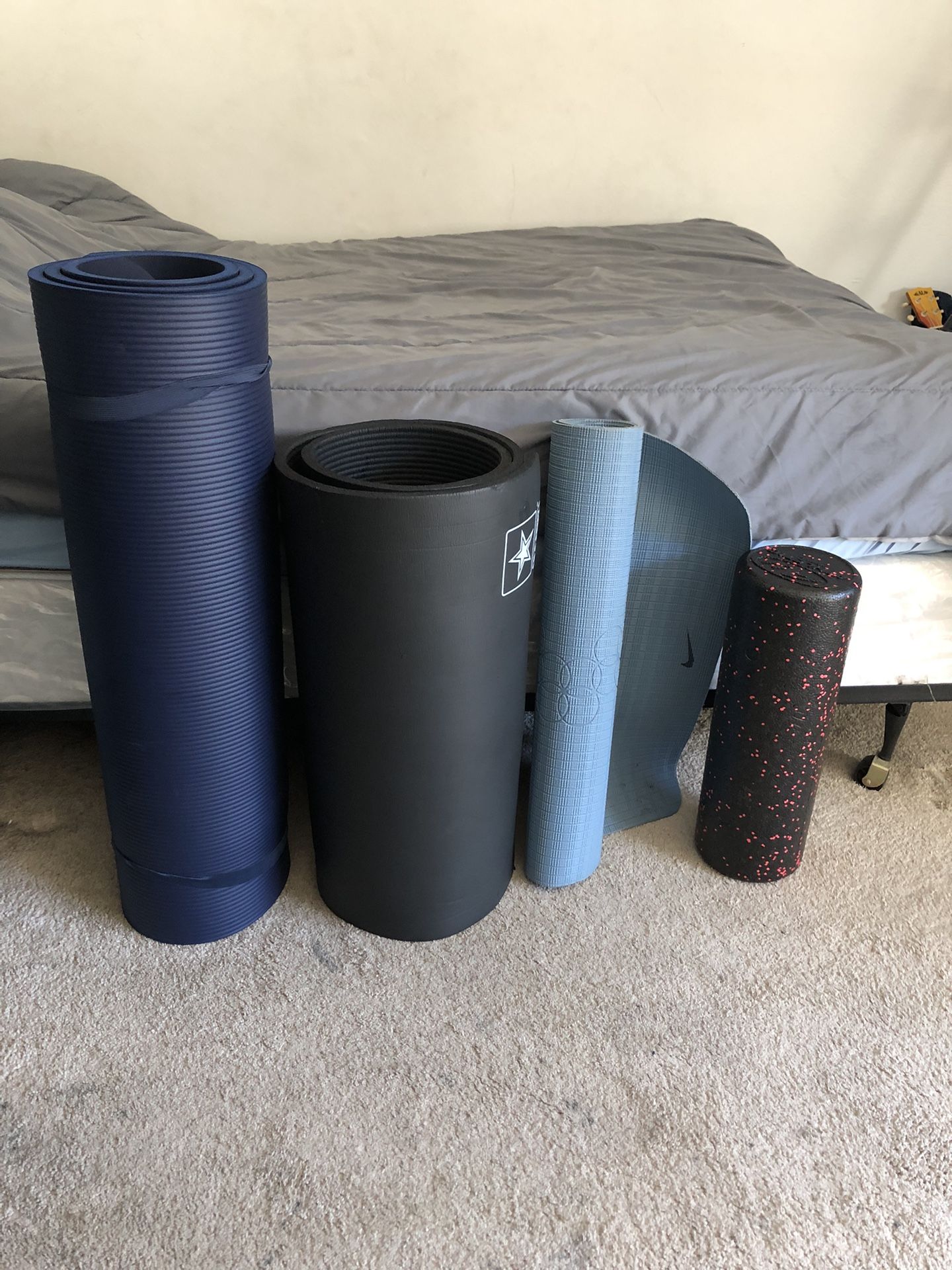 One XL and thick yoga mat, one Larger and thick yoga mat (army), one thin regular yoga mat (Nike), and foam roller. 45$ all used a couple times except the Nike one. That is a lil more used