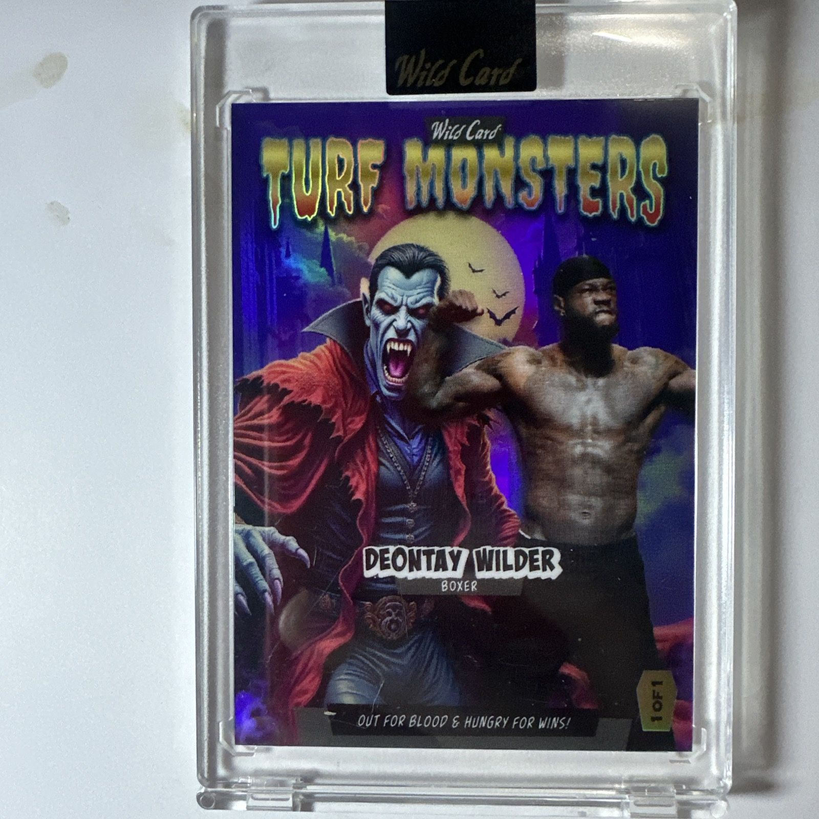 2025 Wild Card Haunted Hits Turf Monster" de edición limitada, específicamente una variante 1-de-1 (la única existente) que presenta al boxeador Deontay Wilder. Boxer