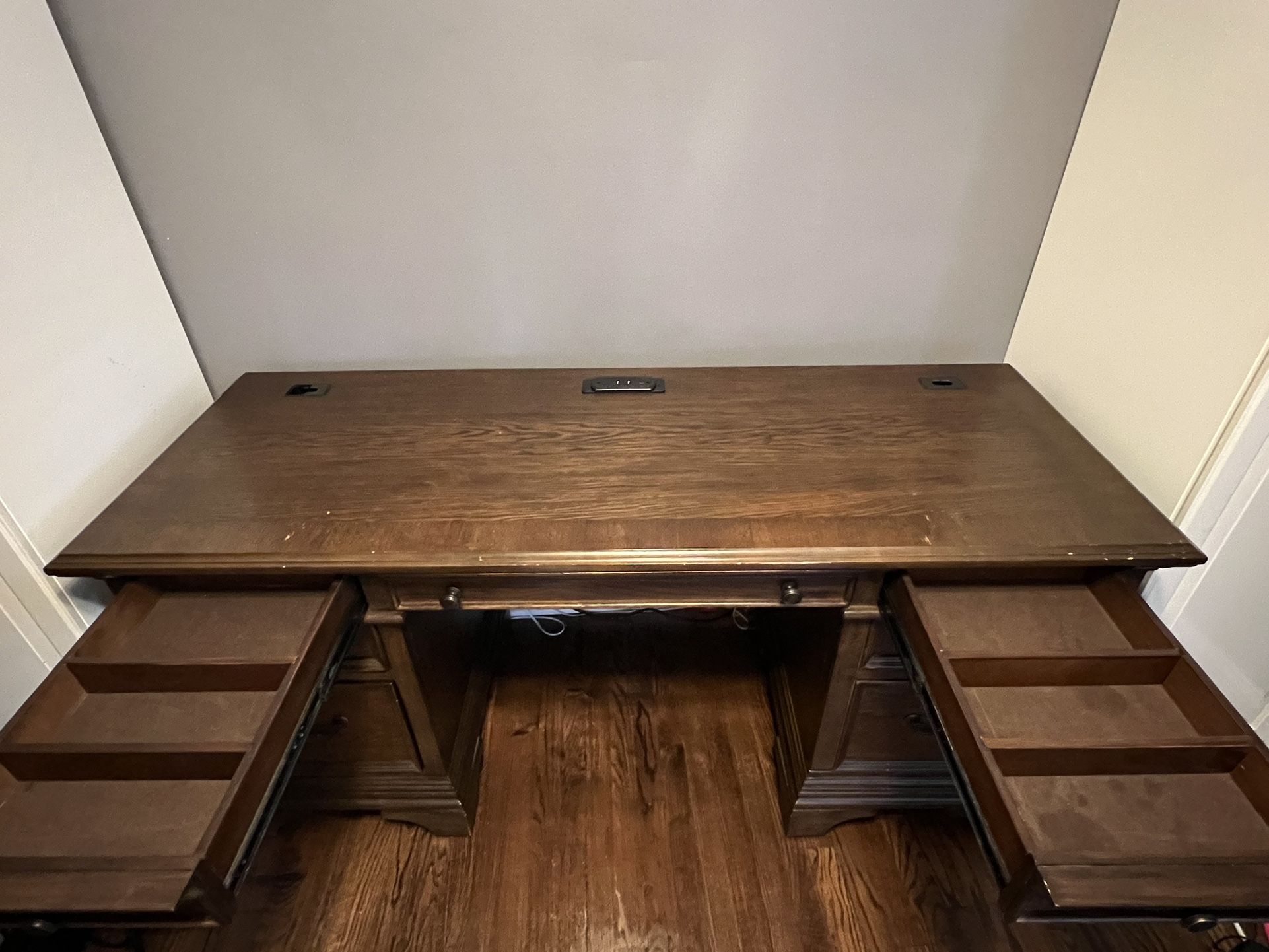 Title says it all, I’d say very good condition on the heavier side. Must bring your own person to help remove it from my back porch or $100 delivery to your door (not doing stairs) within 15 miles of 60630 only missing item is one of the cable drop metal pieces as pictured. https://offerup.com/redirect/?o=aHR0cHM6Ly93d3cuYW1lcmljYXN3aG9sZXNhbGUubmV0L2VuL3Byb2R1Y3QvNjQ1MzYwLWNvYXN0ZXItZnVybml0dXJlLWhhcnRzaGlsbC04ODEyODItNjYtaW5jaC01LWRyYXdlci1jcmVkZW56YS1vZmZpY2UtZGVzay1idXJuaXNoLW9haw==