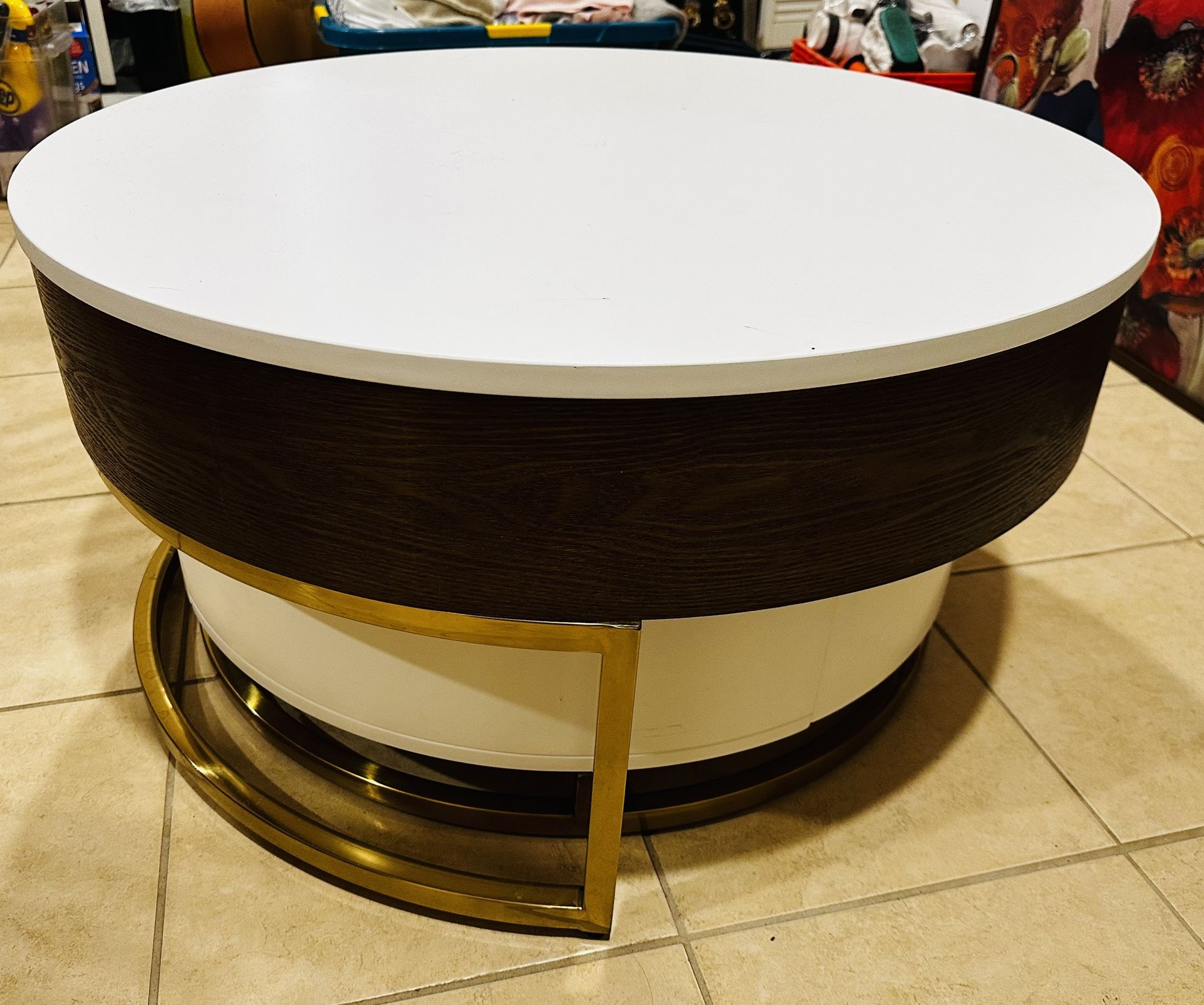 🪑 Modern Rotating Coffee Table with Hidden Storage Sleek, space-saving, and functional—this modern rotating coffee table is the perfect centerpiece for any living room. For local Pick up, Jersey City Heights ✨ Features: • 360° swivel design – top and lower tiers rotate for flexible layout and easy access • Multi-level surface – great for decor, drinks, or entertaining • Hidden storage compartments – keep your space clutter-free • Modern mixed materials – white tabletop, marble-style accent, warm wood, and gold metal base • Compact yet versatile – expands when needed, tucks in when not 📏 Style & Function: This piece combines contemporary design with smart storage. The rotating layers allow you to adjust the table to your space—perfect for small apartments or multifunctional living areas. 🛋 Condition: Gently used, in great condition with minor signs of wear.