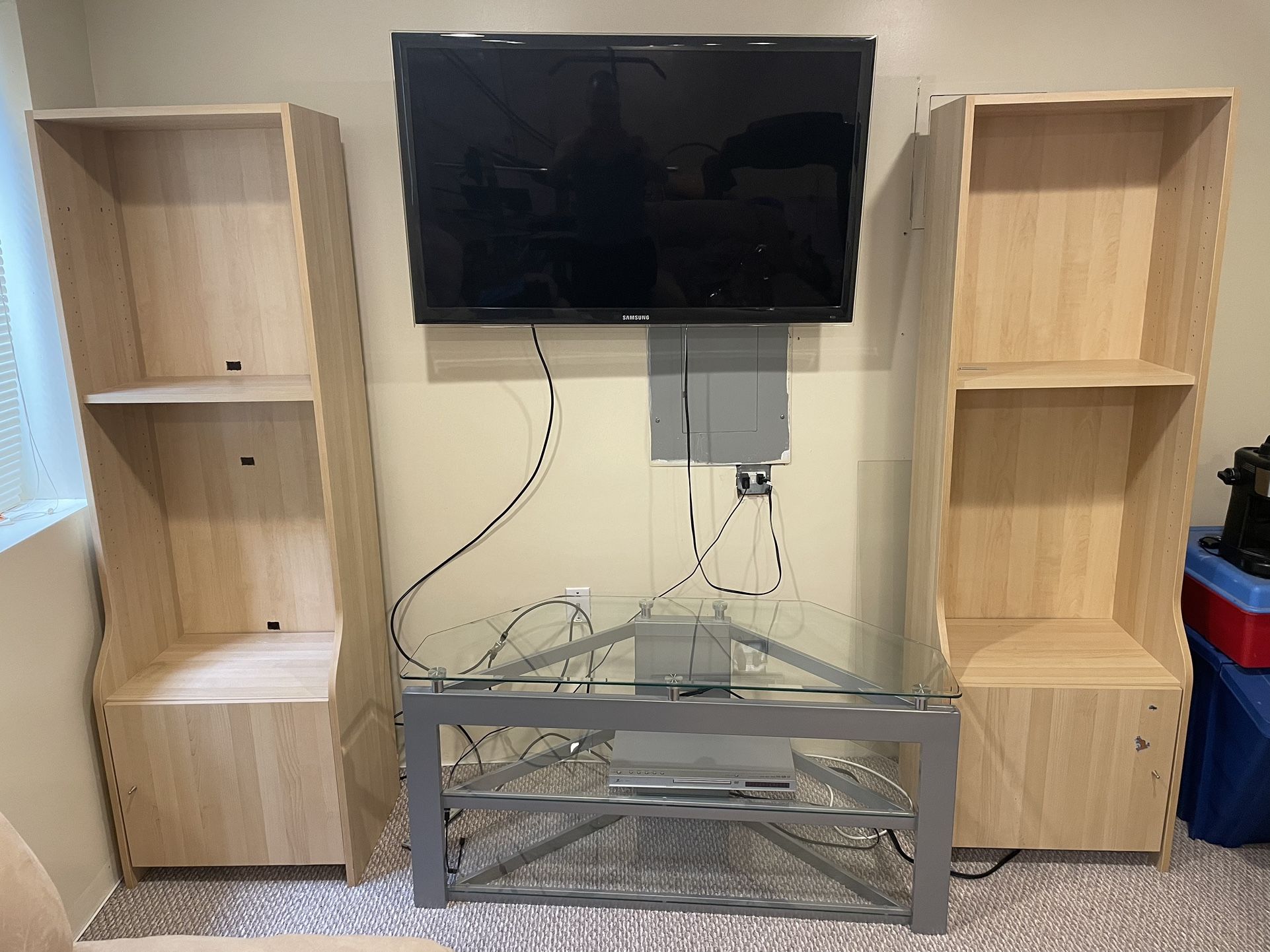 Entertainment center includes a 40 inch Samsung TV. Two tv stands and a glass tv and gaming console table.