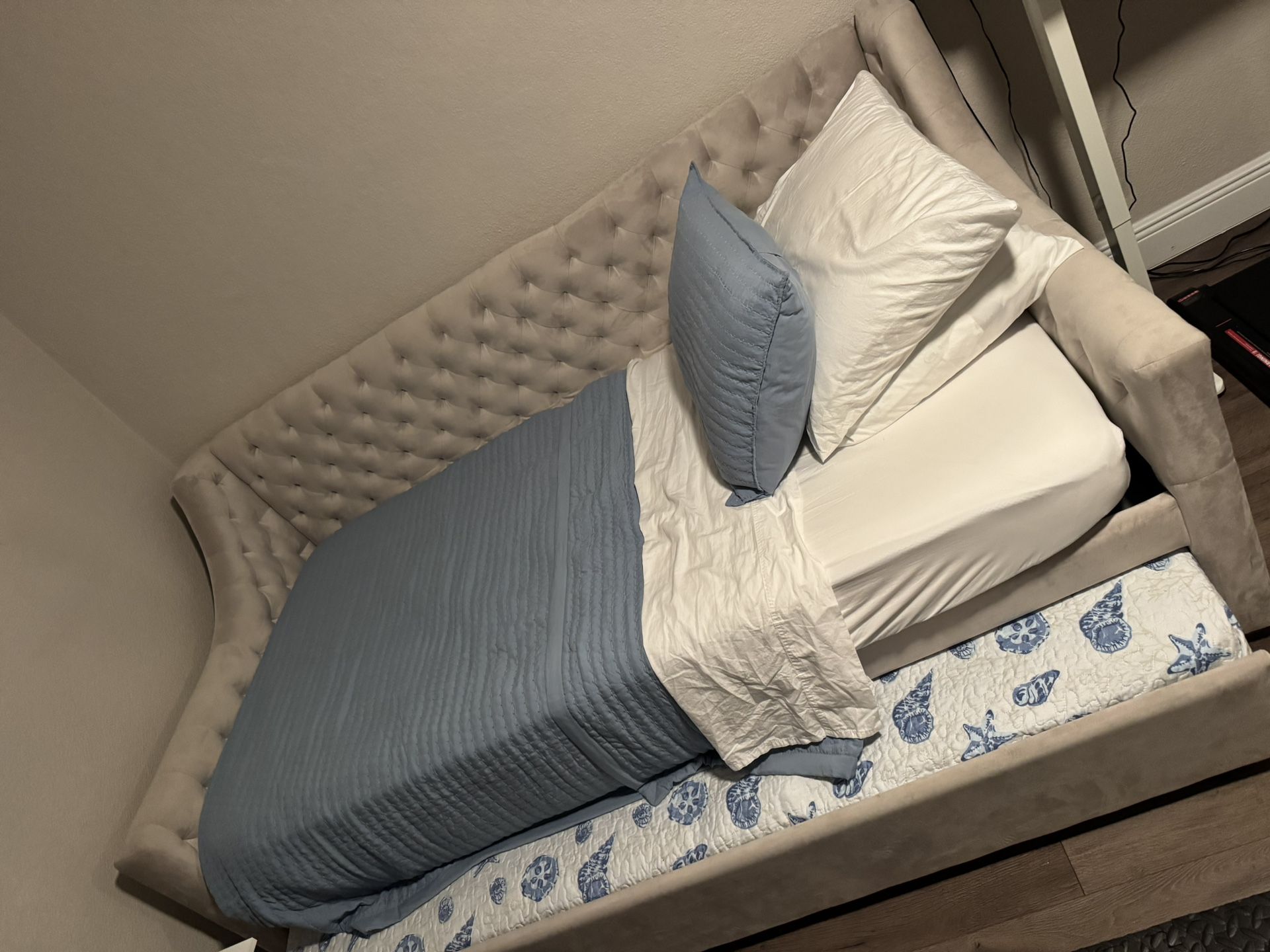 🔥 Premium Listing for $475 🔥 Price: $475 Paid over $630 for the frame alone — plus mattresses and bedding. Selling a beautiful Little Seeds Ambrosia Diamond Tufted Twin Daybed with pull-out twin trundle, two clean mattresses, and two full bedding sets. Everything you need — perfect for a guest room, kids room, or Airbnb setup. ✔ What’s Included • Upholstered tufted twin daybed • Pull-out trundle (twin) • Two twin mattresses (clean, lightly used) • Two bedding sets (blue quilt + shams + white sheets) ✔ Condition • Excellent condition • No rips, stains, odors, or sagging • Clean, well-kept home • Mattresses and bedding are in great shape ✔ Why It’s a Great Deal • Frame alone was $630+ • Mattresses + bedding easily add another $200+ • Total value: $800+ • Yours today for $475