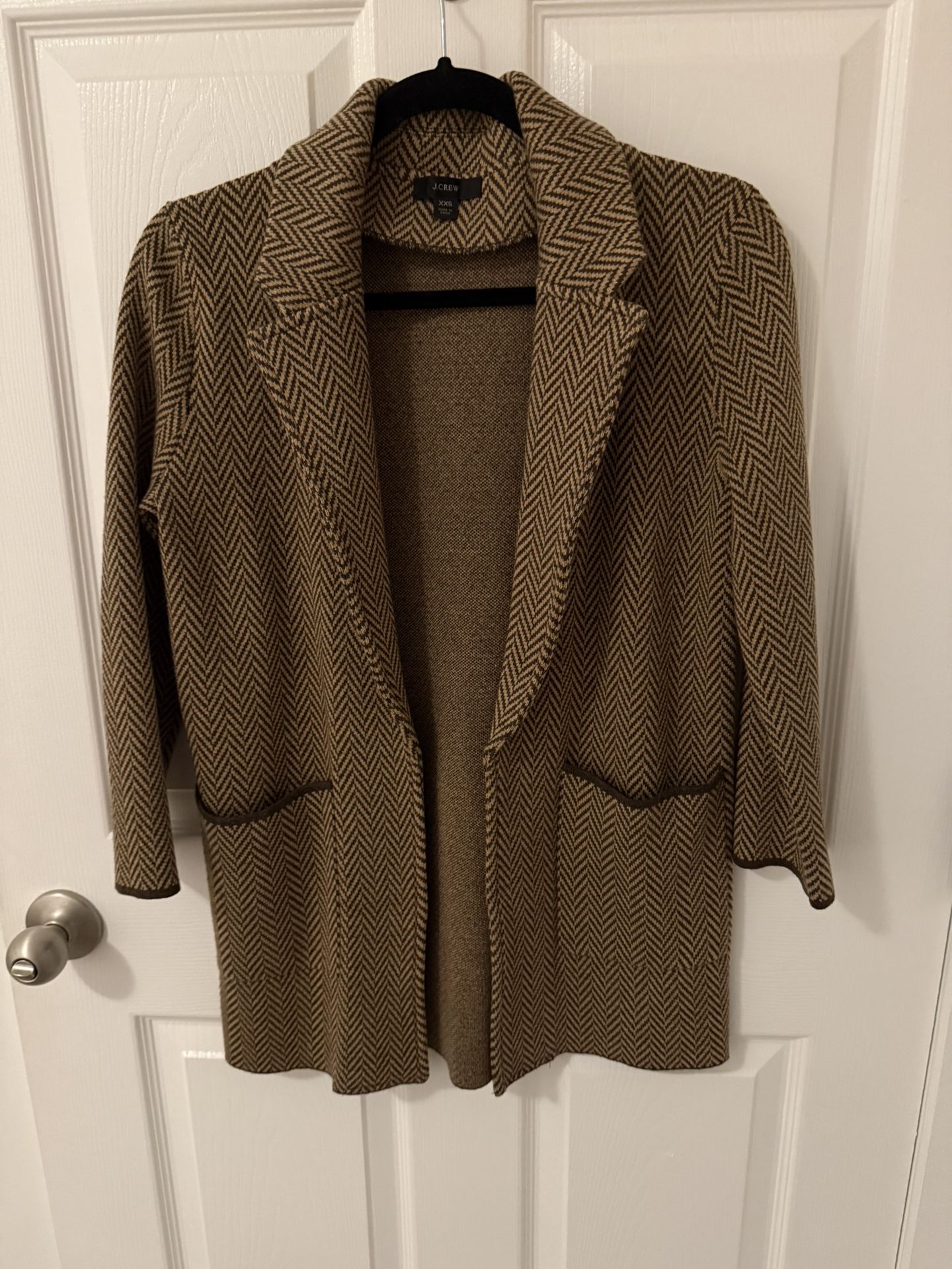 - J. Crew Sophie open-front sweater-blazer in chevron - Excellent condition - A lighter-weight cotton blend you can wear all year long - Size XXS - See photos for dimensions - Relaxed fit - Hits below hip - Cotton/poly/merino wool - Cash and pick up only