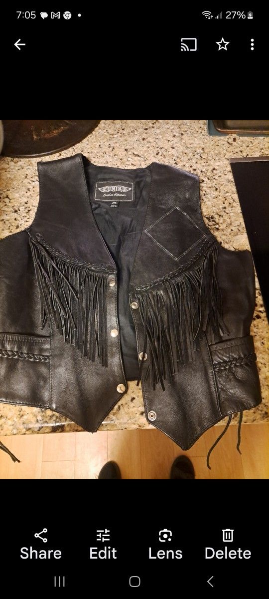 Misses fringed all Leather motorcycle Vest. Perfect for riding your Harley. XINT COND. Worn only a few times. LIKE NEW size XL Helmets listed separate listing