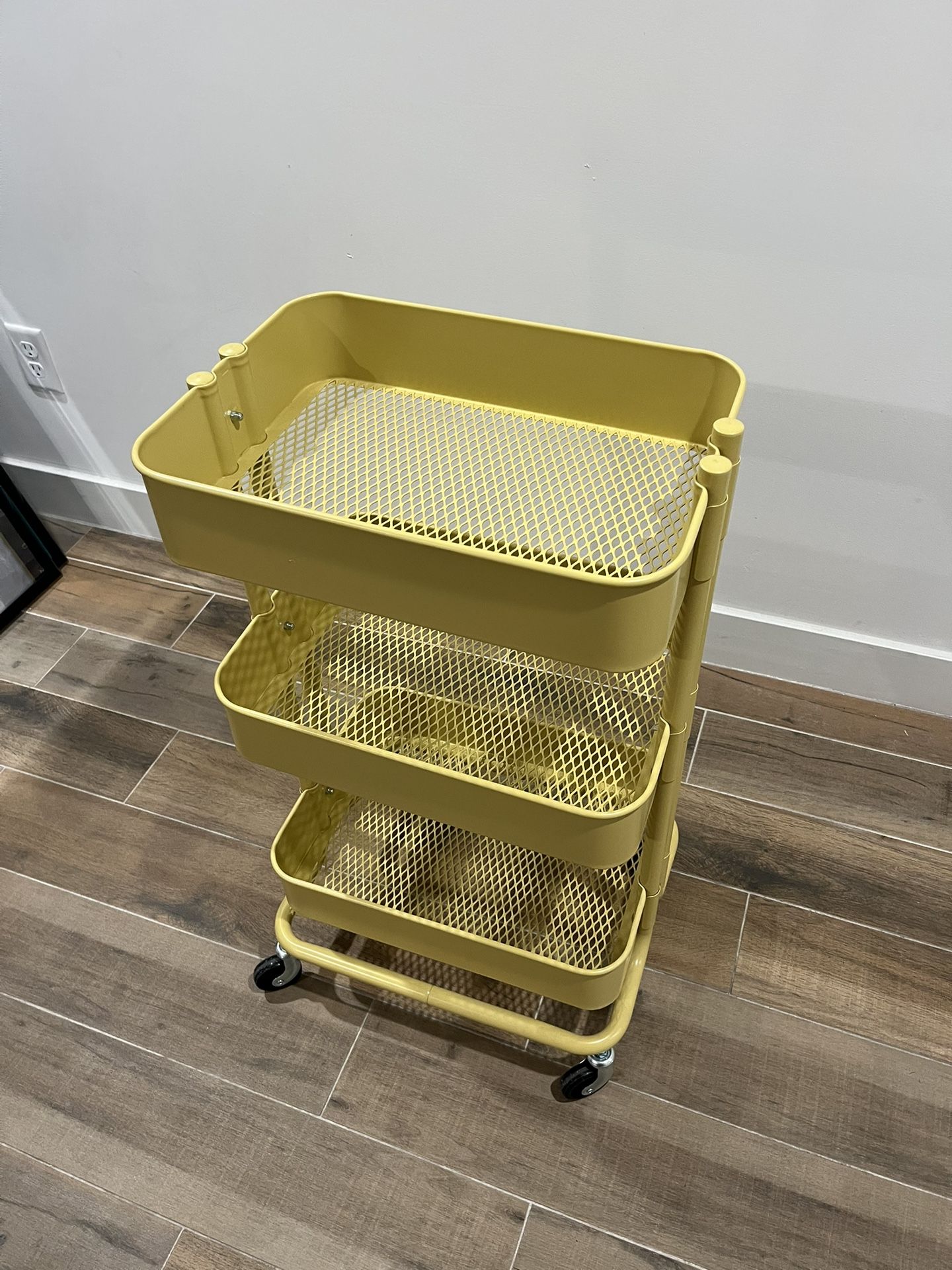 Awesome rolling cart from IKEA! Gorgeous yellow metal wire shelves with caster wheels for easy portability. 31 inches tall and 17 and 1/2 inches in width.