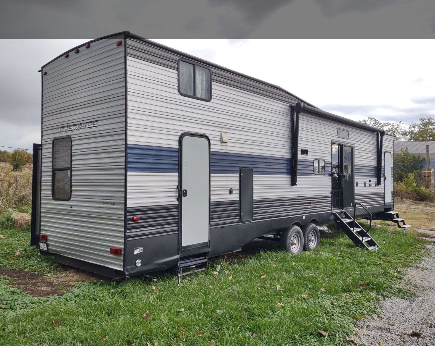 2020 FOREST RIVER Cherokee 39CA, Cherokee by Forest River Destination Trailer, with an upstairs Loft for the kids and 3 slide-outs. The Cherokee 39CA has Two Full Bathrooms! Up front you will find the master bedroom with queen bed slide, wardrobe, dresser and linen closet with washer and dryer prep. Next is the side aisle master bath with toilet, vanity, and one Very Large Shower. The beautiful kitchen features full size appliances like the 18 cu. ft. refrigerator, a Walk In Pantry, large u-shaped dinette and sofa. Down two steps you will find the office/ guest bedroom and 2nd bath with toilet, sink and shower. Next to that are the stairs that take you to the Loft that any kid would love to sleep or just hang out and play or watch a movie as it has all the hookups. There are three entry doors, front master bedroom, main entrance with patio doors and 2nd bathroom entry door. Options Included: LG Washer /Dryer Combo FOGATTI RV Tankless Water Heater 1- 15K A/C IPO 1- 13.5K Standard A/C, 2- 30# LP Bottles with Cover, 50” LG LED TV Black Tank Flush, Ceiling Fan 12V in Living Room, Detachable Hitch, Enclosed Tanks, Solar powered Juice Pack Listed below are the following packages already included: XL Package: with DSI Bathroom Fantastic Vent Fan Large Exterior Folding Grab Handle Night Shades Outside Shower w/Hot & Cold Water Pull out Kitchen Faucet RVQ Quick Connect Skylight over Tub LIMITED PACKAGE Detachable Power Cord Exterior LED Strip Lighting Exterior Scare Light Fireplace LED Interior Lights LED Strip Lighting Mag Wheels Power Awning Premium Remote Control Awning Residential Under-mount Kitchen Sink Residential Wood Blinds Tire Pressure Monitors Tub Surround Upgraded Designer Glass Back Splash Kitchen Appliance Package Windows USB Charging Stations