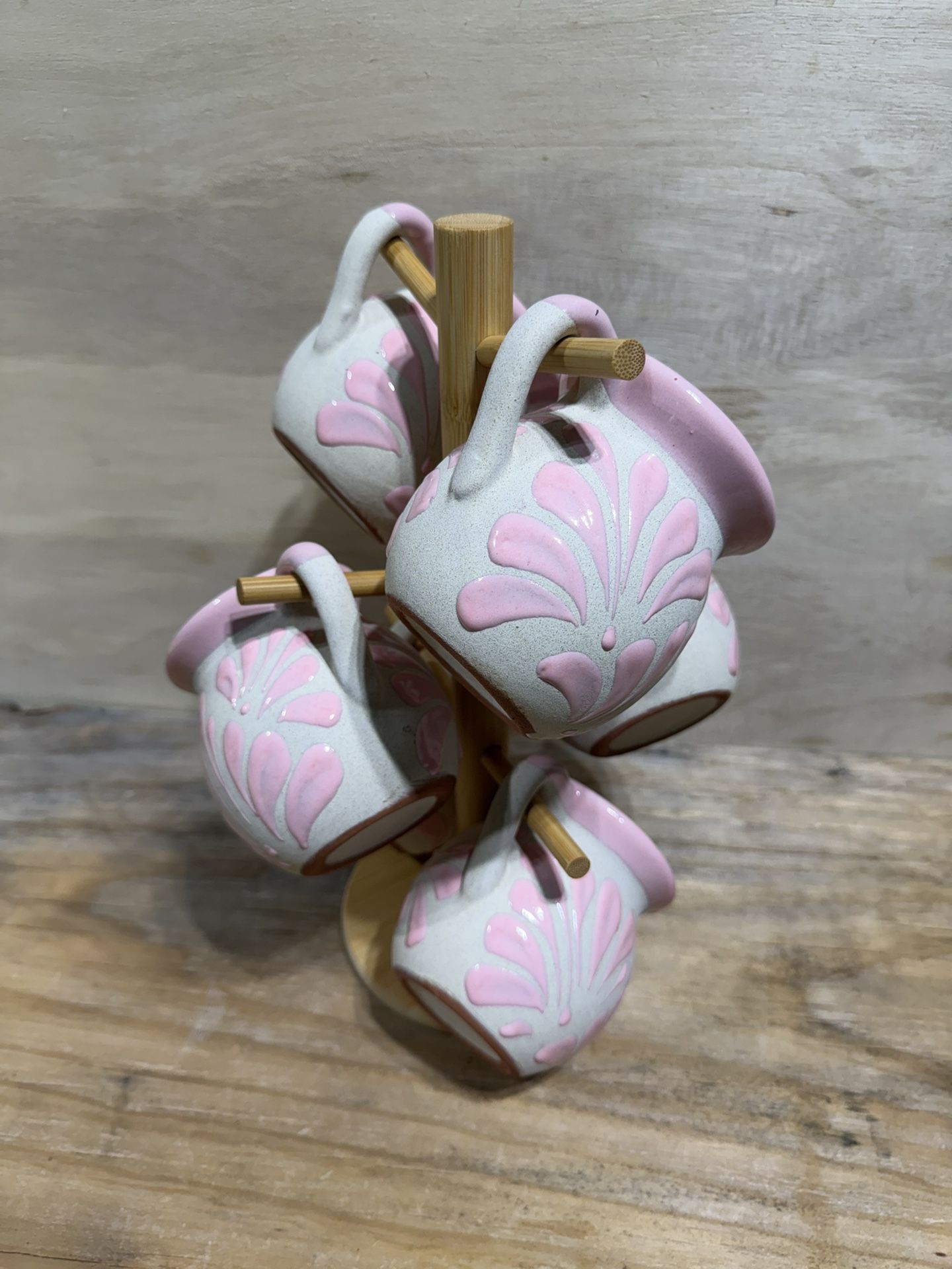 Yes it’s available!! 6 Mexican pink engobe coffee mugs 4” tall, 3 3/8” wide, 12 oz capacity, wood stand included $45. Price is firm.