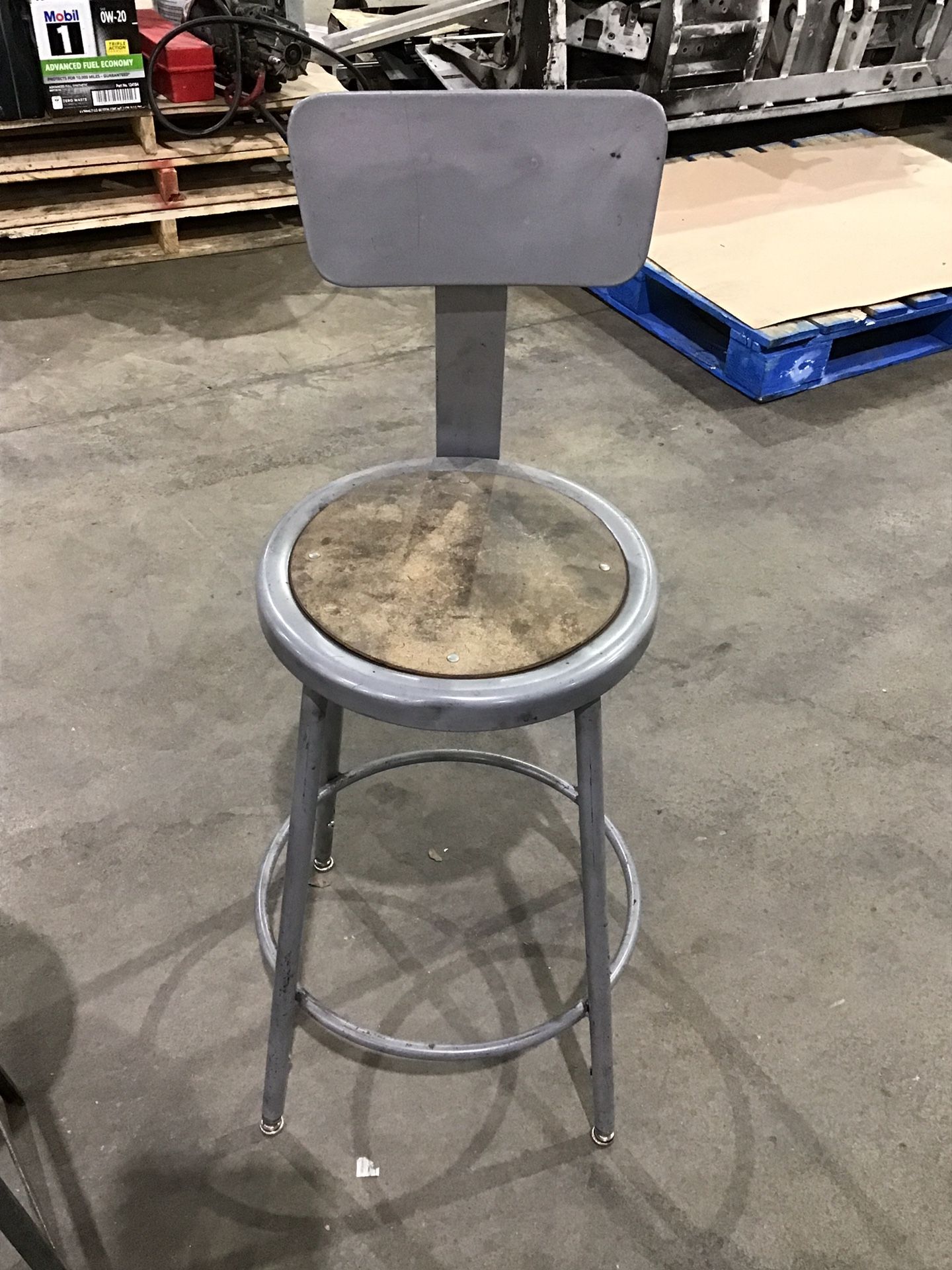 Gray Metal Stool, Round Seat & Backrest, Adjustable 24” - 34” Height (1 Available)