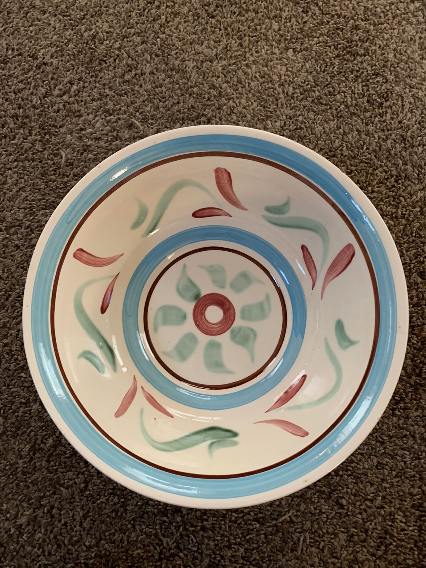 Vintage RRP Co. Roseville Large Bowl This vintage hand-decorated large bowl, produced by RRP Co. Inc. (Robinson Ransbottom) of Roseville, Ohio, measures approximately 12 inches in diameter and stands approximately 4 ½ inches deep. It is believed to date from the 1950s. The bottom has some chip and a small chip on the edge which it’s easily to miss. Other than that it’s in good vintage condition Please see pictures carefully before buying Weight: 3 lbs 9.6oz