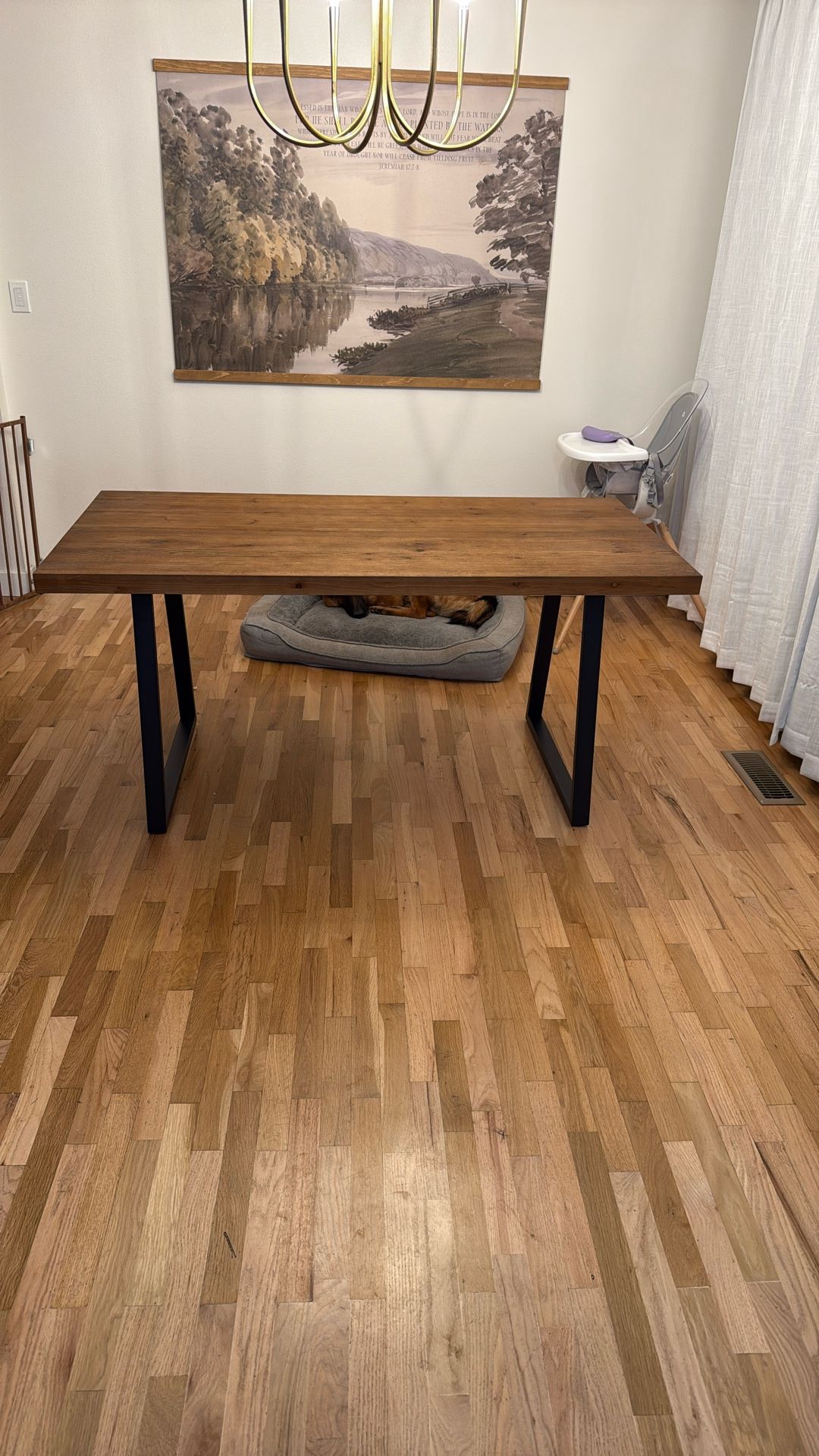 New Dining Table. 63”x31.5. Just bought and put together. Too small for my space. Black metal legs. Wood top.