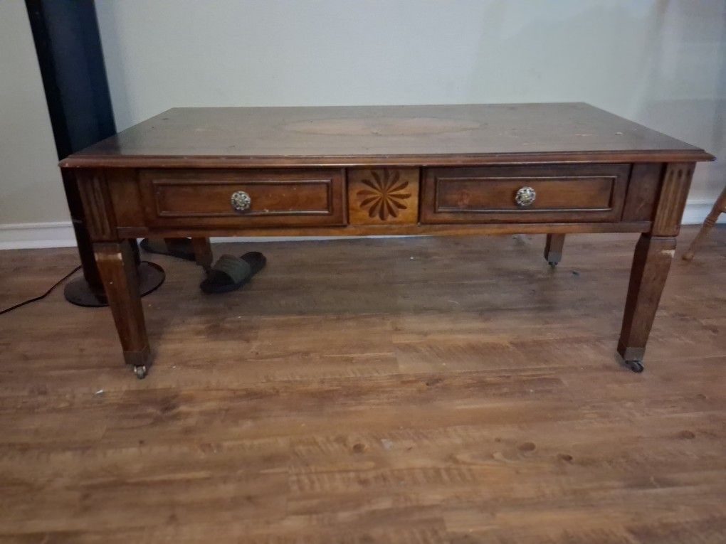 Solid wood coffee table with brass wheels. Movable table with two drawrs. 50 or obo
