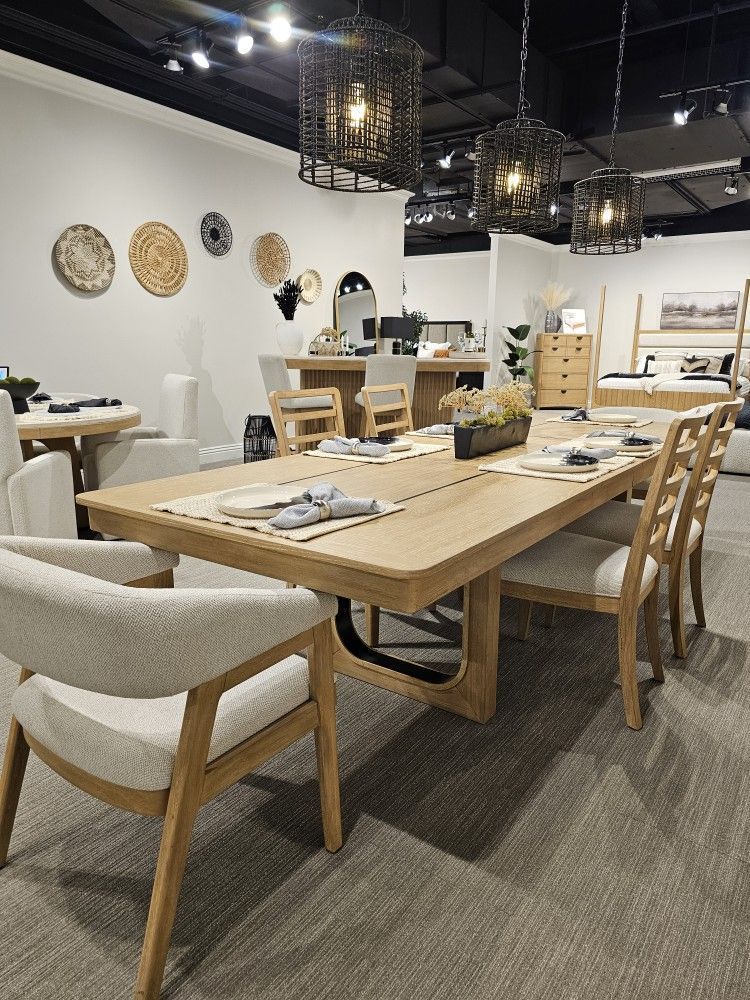 7 pc Modern Escape Dining Table Set From $2999 Now Special $2499! Includes dining table, 4 ladder back chairs and 2 barrel chairs. Dining Table Special $1399, Ladder Back Chair Special $199, Barrel Chair Special $349 and 90" Console Special $1415. Dimensions: Dining Table; 84" (102" - 120") x 44" x 30"H 90" Console Table; 90" x 18" x 34"H Its unique designs draw upon a palette of nature-inspired materials, including authentic oak wood grains in a soft natural finish, genuine sandstone, woven cane, warm bronze metal, and slubby woven textiles. Simplified silhouettes and gentle curves create a visual that promotes comfort and relaxation.**EVERYONE QUALIFIES** ** NO CREDIT NEED IT** ** 90 DAY PURCHASE OPTION** **SHOP NOW, PAY LATER, ALL WITHOUT CREDIT Monday to Friday 10:00 am to 7:00 pm Saturday 10:00 am to 6:00 pm. Sunday 10:00 am to 5:00 pm. **INVENTORY CHANGES DAILY MESSAGE FOR MORE DETAILS. PLEASE CHECK MY OFFERS I HAVE MORE QUALITY FURNITURE! Sofa, chaise, couch, fabrics, comfortable, sectional, chair, living room, family room, coffee table, End Table, TV stand, Credenza, cabinet, mirror, accent chair, Art Pictures, decorations, lamps, Dining Table, Dining Chair, Wood, Modern, Sofa, Chair, dinette, Patio Furniture, Stool, Chaise Lounge, Standing Desk, Murphy Bed, TV Stand, Accent Chair, Bar Stool, Bunk Bed, Daybed, Coffee Table, Credenza, Buffet, China Hutch, kitchen, Bar Cabinet, Console Table, Sideboard, Folding Table, Accent Table, office, decor, rug, plant, home, house, server, flower, mirror, marble, fireplace, velvet, art, picture, wall, paint, counter, ottoman, bookshelf, desk, file, base, bench, chest, dresser, headboard, mattress, memory, foam, spring, armoire, curio, lamp, light, led.