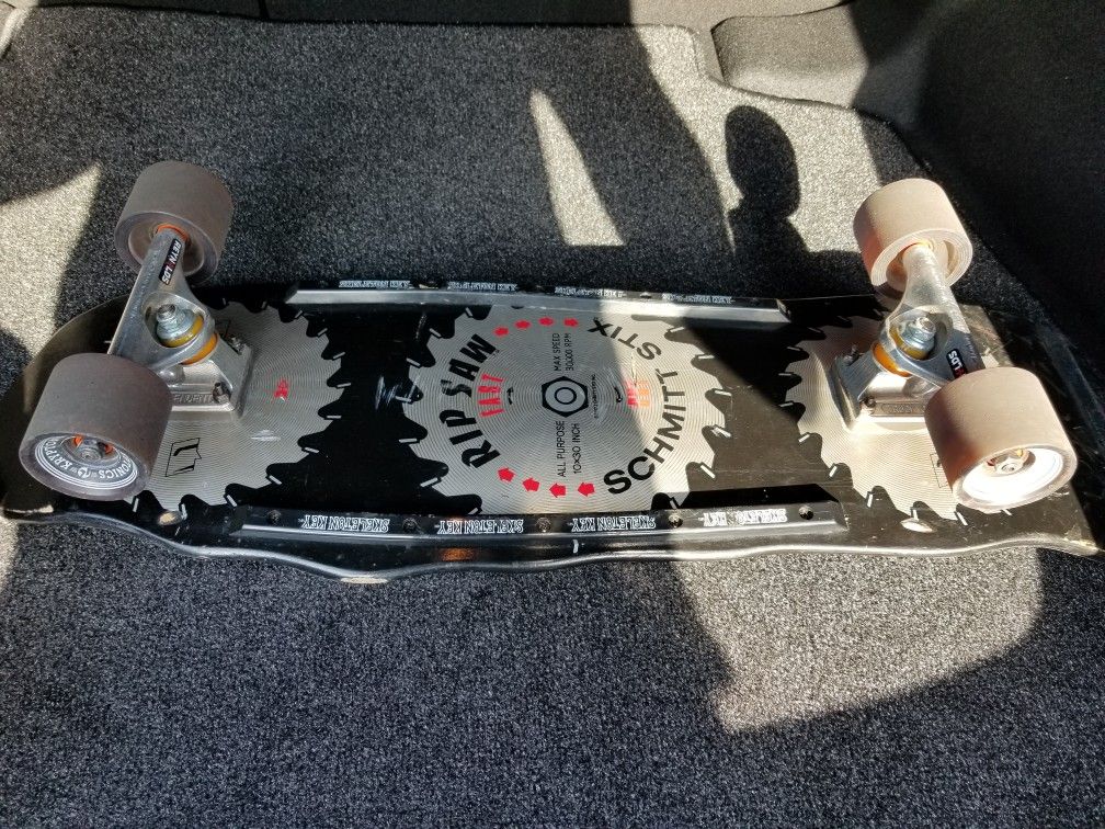 Long board in great shape. It includes the following: Schmitt Stix ripsaw complete Trucks Risers Wheels Upgraded bearings( smooth/fast cruise) New grip tape Creature skeleton key rails and tail bone No chips or pressure cracks **OBO**