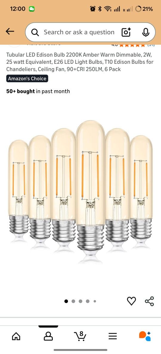 Tubular LED Edison Bulb 2200K Amber Warm Dimmable, 2W, 25 watt Equivalent, E26 LED Light Bulbs, T10 Edison Bulbs for Chandeliers, Ceiling Fan, 90+CRI
