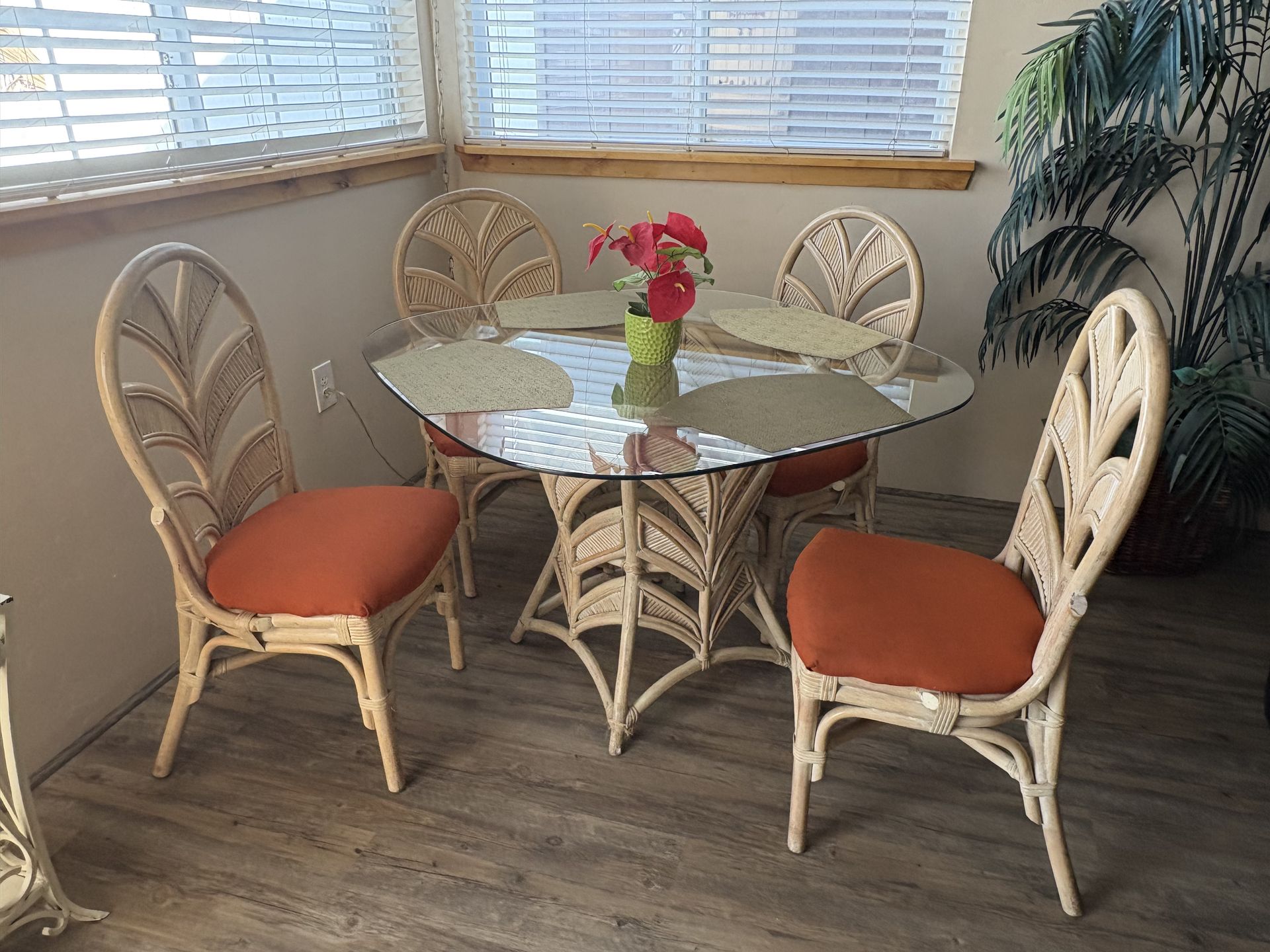 Rattan table and 4 chairs with 42” glass table top. Great shape