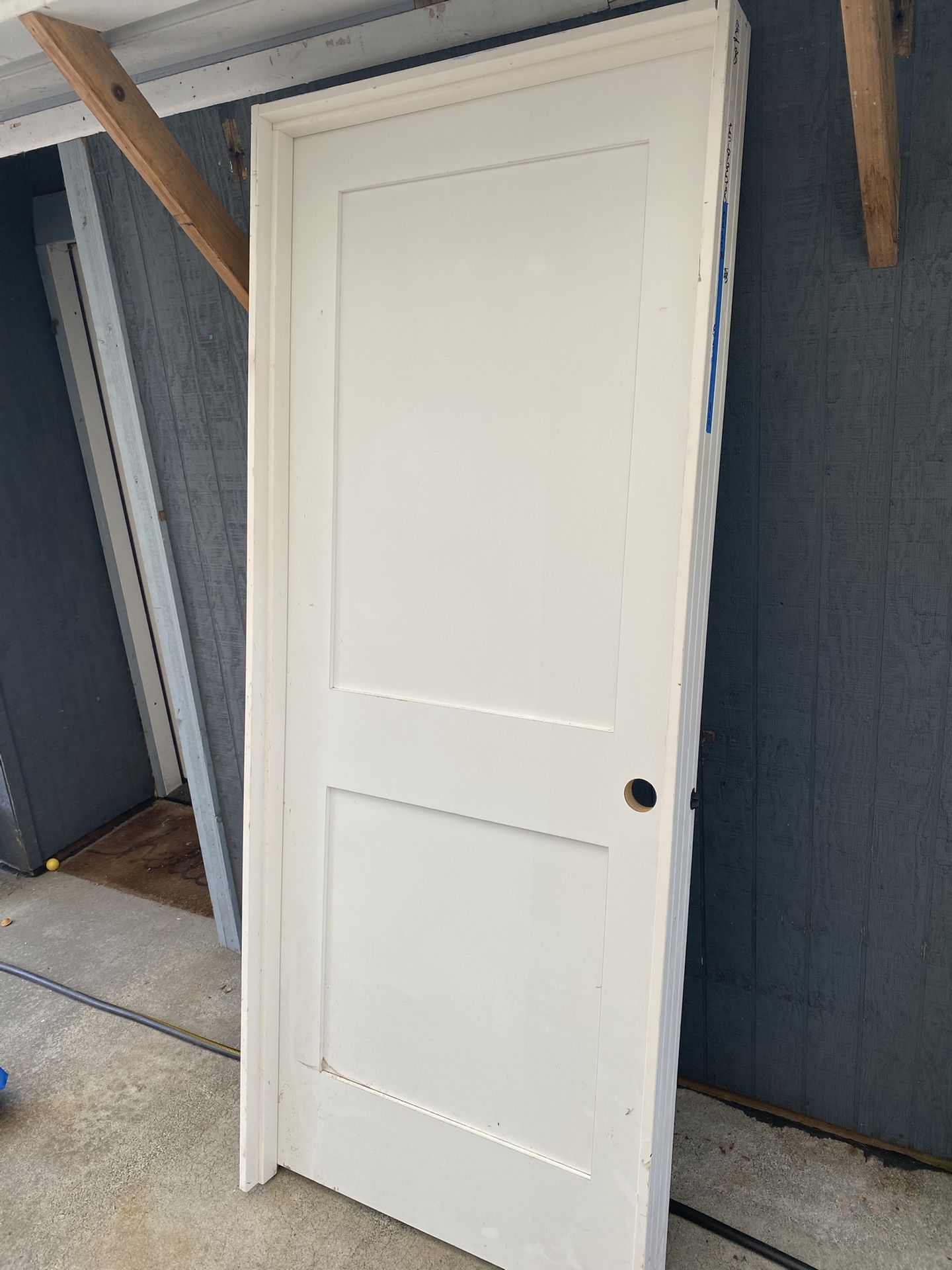 White primed solid core interior doors- pre hung with door frame and hardware. Never installed- I just had to shift directions with the project, so never were used. 34x82 rough opening. 3 left-hand in swing, 1 right hand swing. some cracking on one due to some moisture. I’ll cut you a good deal if you take them all!