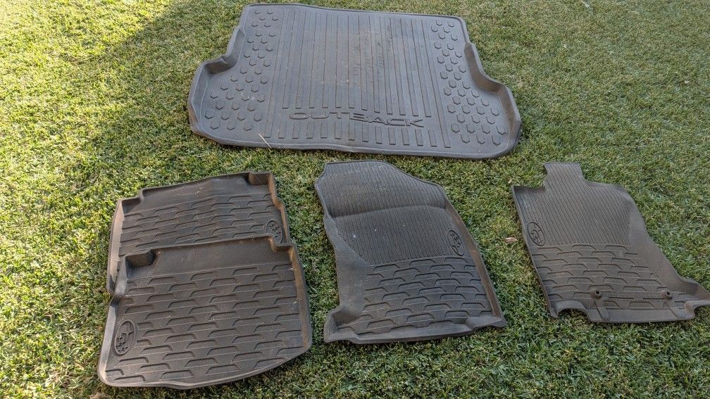 Original Subaru rubber floor mats. Fits all Subaru Outback models. Set of five (5) mats including the trunk mat liner that sits on top of the carpeted trunk. Driver side + passenger side and two rear floor mats for the back seats. All came out of a brand new 2019 Subaru Outback. Original parts purchased from the dealership directly. Price is firm. Message with serious offers only