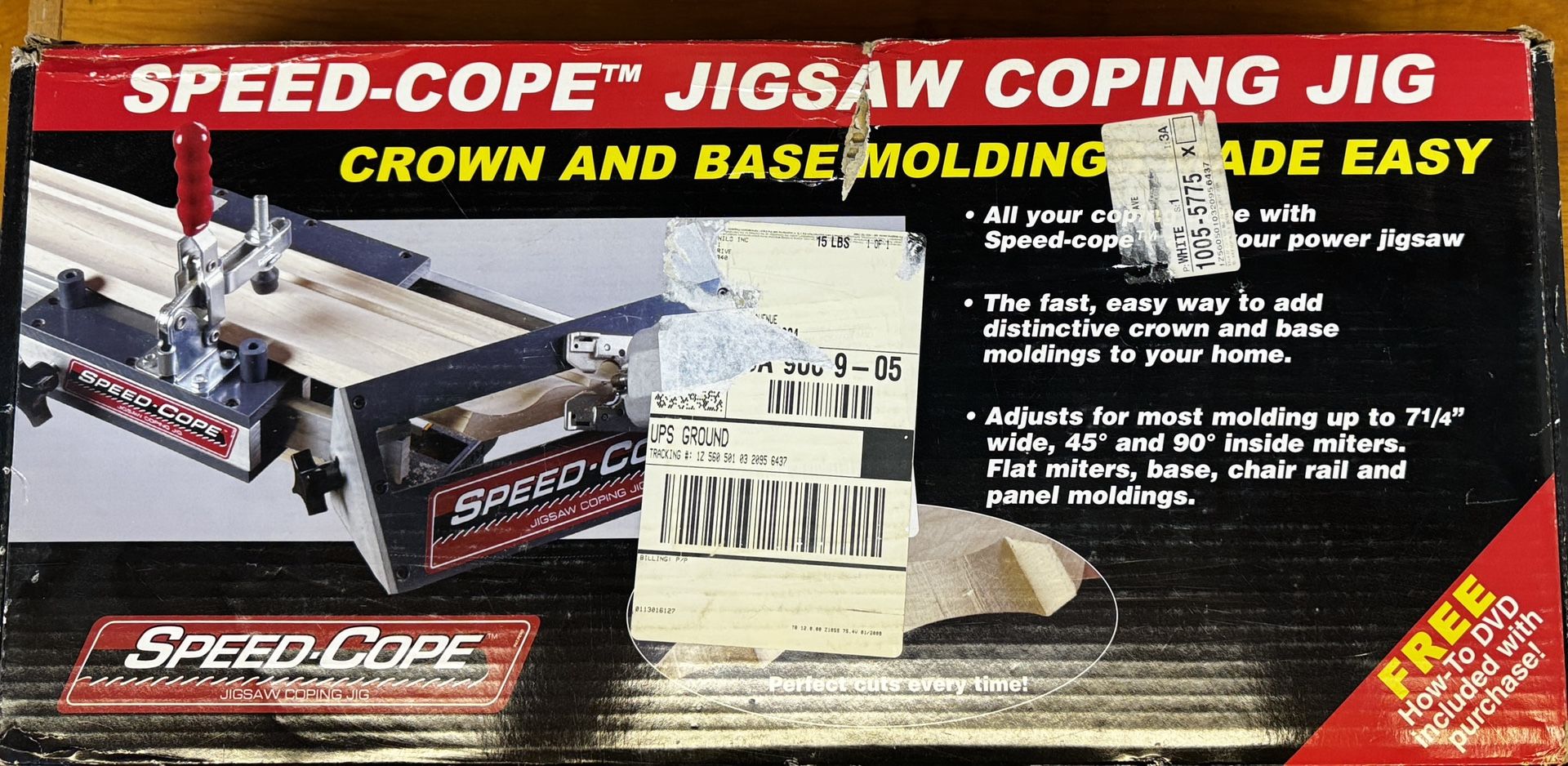 Brand New, Unopened Speed-Cope Jigsaw Coping Jig! Perfect for woodworkers and DIYers, this innovative jig makes precise cope and miter cuts in crown and base molding up to 7-1/4" wide effortless. Designed for use with a power jigsaw, it supports 45° and 90° inside miters, flat miters, and more, ensuring tight-fitting joints for professional results. Easy to assemble and built to last, it includes a how-to DVD to guide you. Ideal for contractors and home improvement projects.