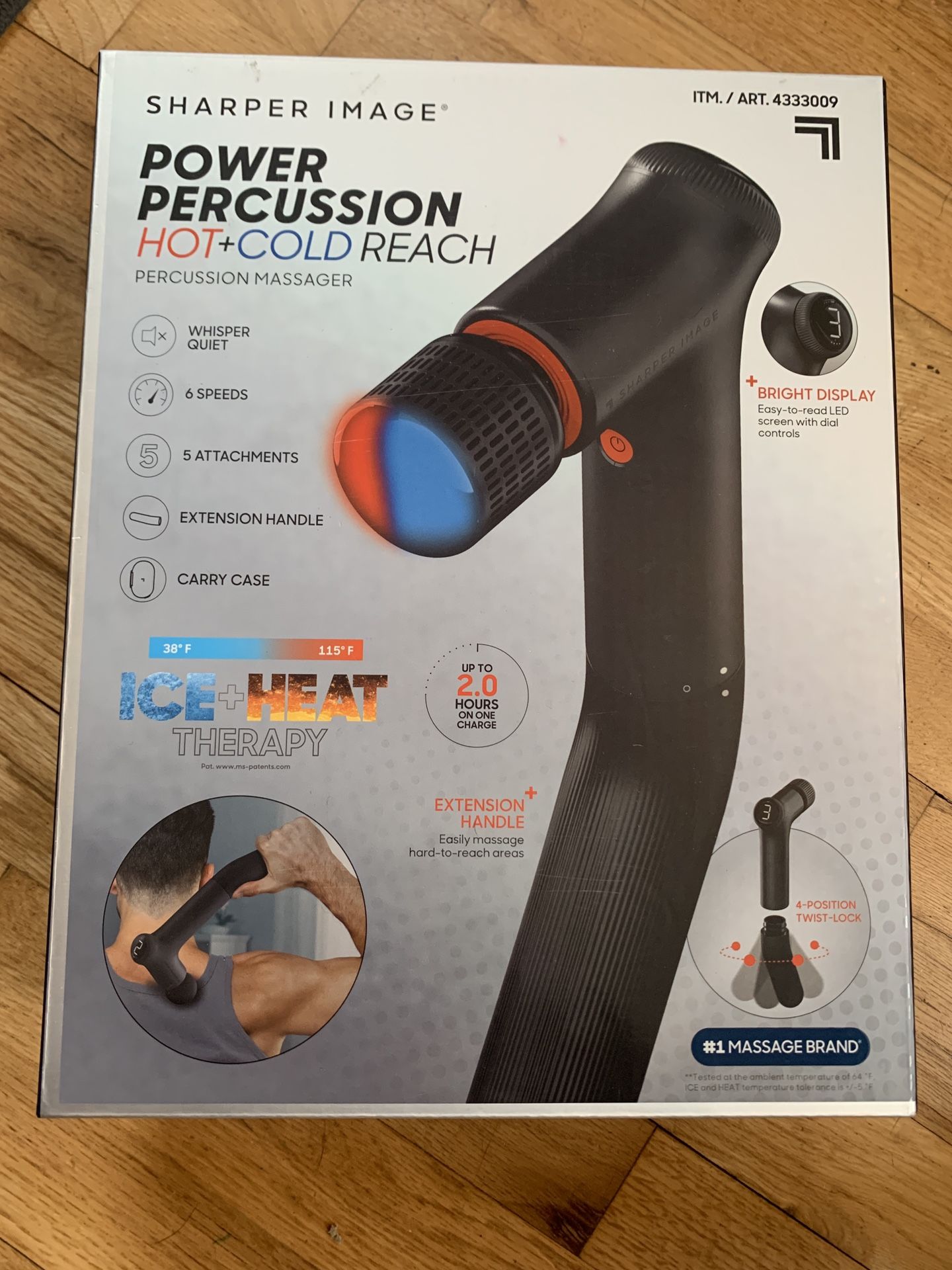 Massage gun, brand new in box, never opened. Retails for $135. Here’s the official description: The Sharper Image® Power Percussion Hot + Cold Reach Massager offers fast-acting hot and cold therapy to ease muscle tension and soreness. Use the Hot + Cold Node to heat up to 115°F or cool down to 38°F in seconds, with six temperature levels for personalized relief. The optional extension handle helps target hard-to-reach areas like your back and legs with ease. With six speeds, five attachments, and a travel case, this versatile massager brings customizable recovery wherever you go. * Hot or Cold Therapeutic Relief in Seconds * Optional Extension Handle for Easy Reach * 6 Speeds with Bright LED Display and Dial * Whisper-Quiet with Quiet-Drive Technology * USB-C Rechargeable with 2-Hour Runtime