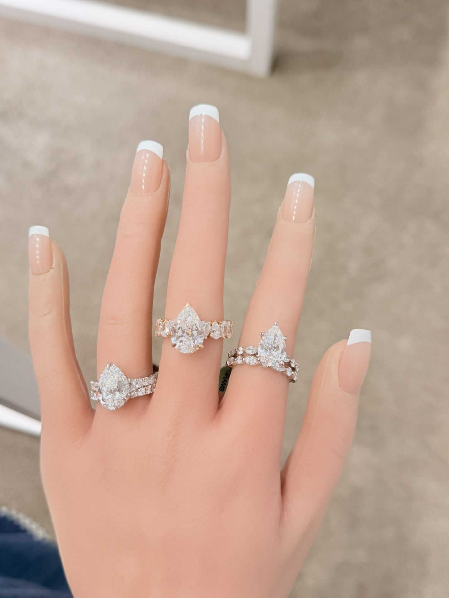 14KT Yellow/White Gold Lab Diamond IGI Certified Laser Inscribed Shape Pear * Index Finger 4.46Ctw/3.05Ct $3295 * Middle Finger 7.01Ctw/4.01Ct $4500 * Wedding Finger 4.53Ctw/3.03Ct $3995 Clarity VS2 Color F Size 7 Financing Options Available Jewelzz Gold and Diamond 5610 Garth Road Baytown Texas