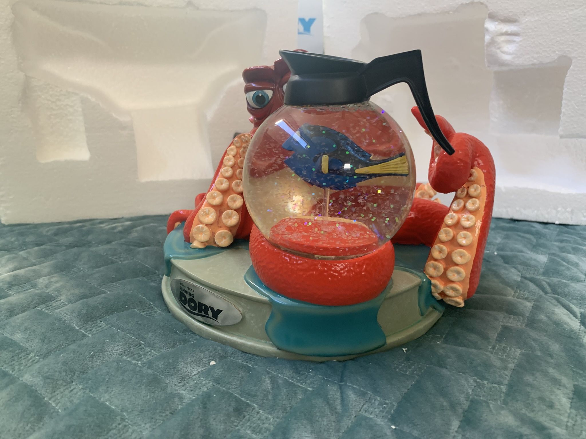 Finding Dory Snow Globe is brand new. It was only taken out of box twice. Once after purchased at Disney World by Orlando Airport TSA since it contains liquid. The second time for these photos. Been sitting on closet shelf in the Disney plastic shopping bag received when purchased. As photos show the internal plastic bag is present as are the unopened batteries.