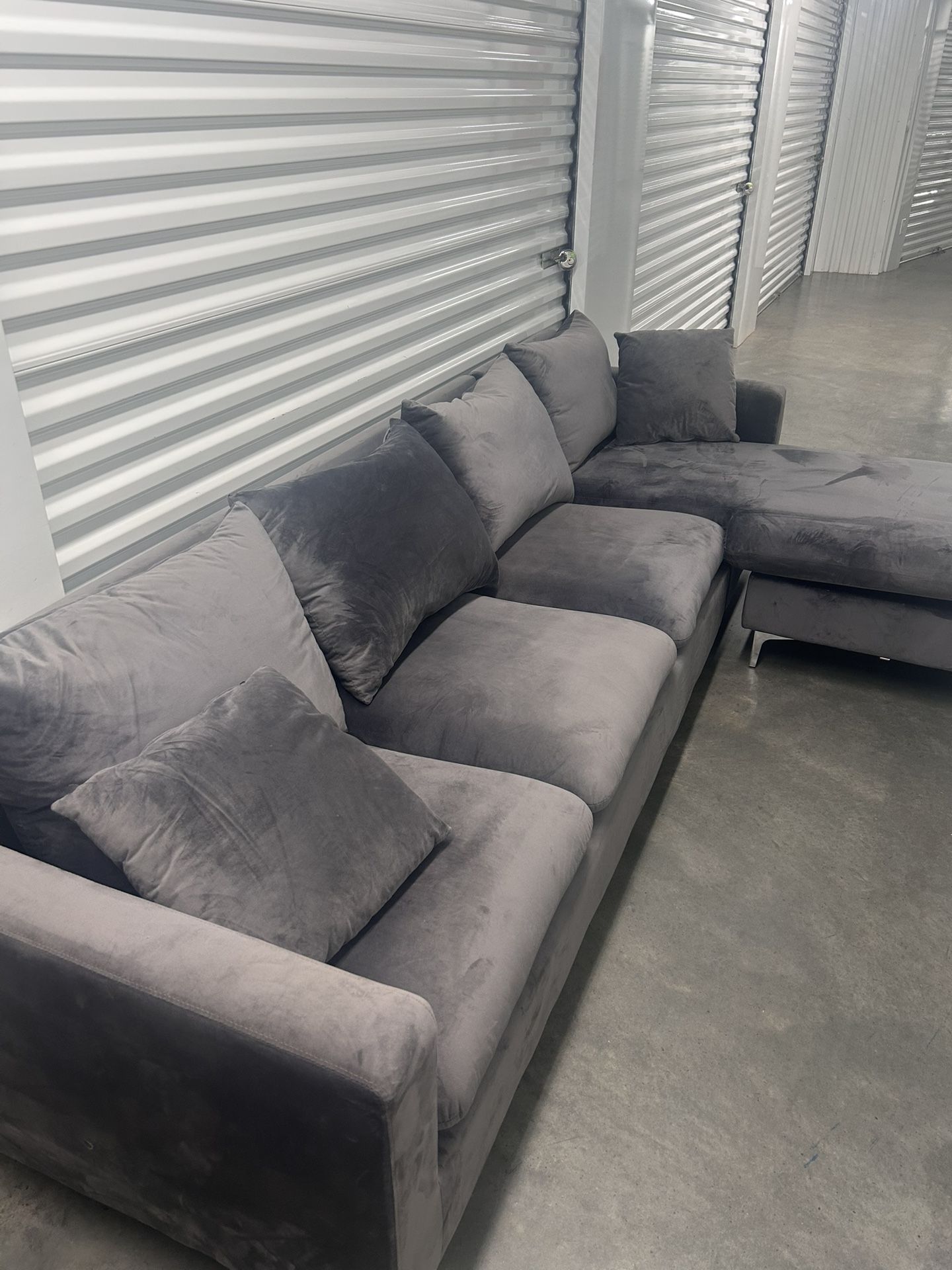Stunning Grey Velvet Sectional! Normal wear but in great condition. Very unique color and would be a great addition to a house or Air BnB. Easily assembled/dis-assembled. Please see other postings, as well! Selling a bunch of household pieces and willing to do a bundle deal!