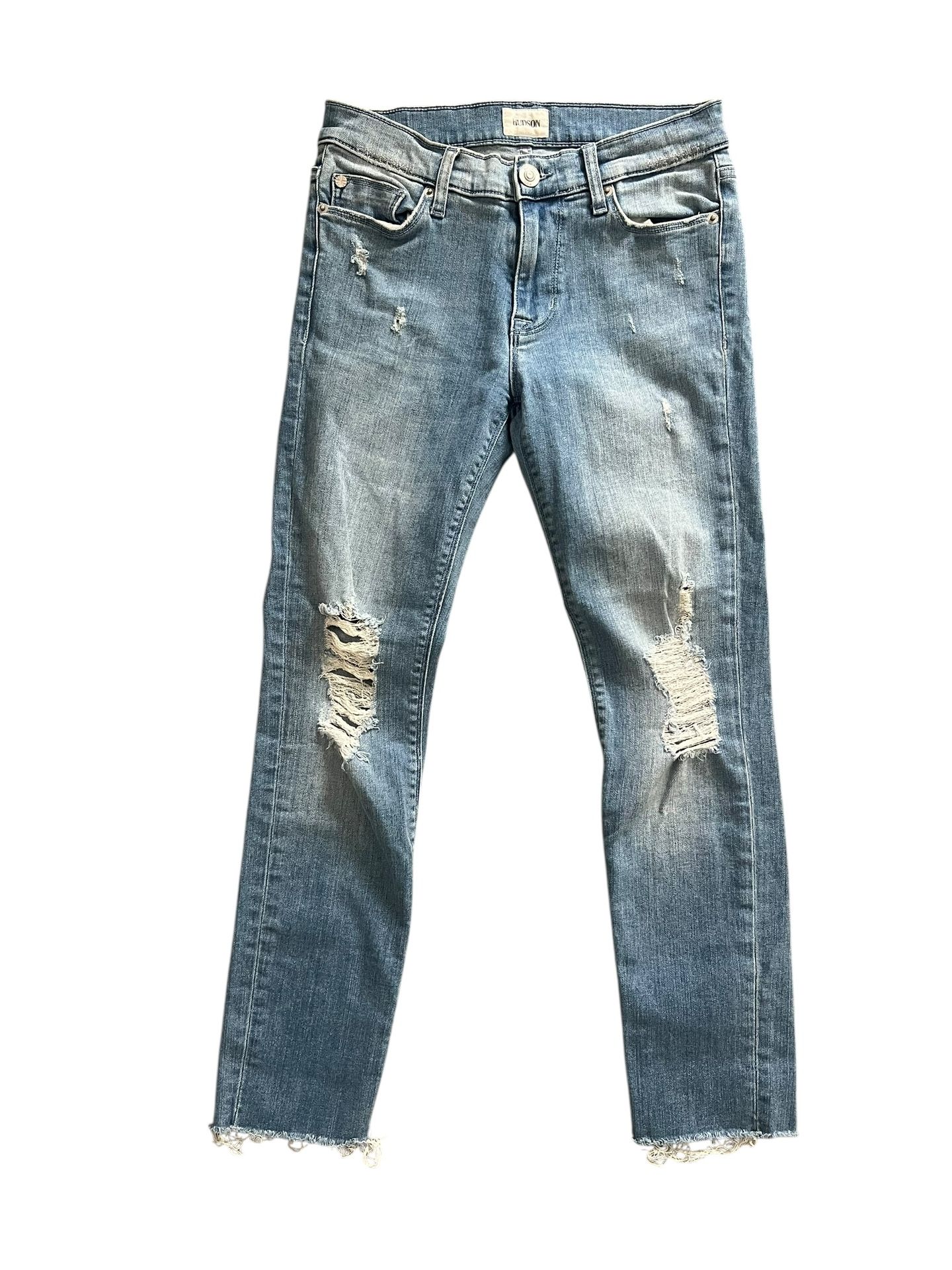 Approximate measurements Waist 13.5 inches Length 35 inches Inseam 25.5 inches 93.5% cotton 5% polyester 1.5% elastane Tally mid rise skinny raw hem STYLE# WMC4004DYA COLOR# SGRC Fit: Mid-rise, skinny fit. Hem: Raw, frayed hem. Material: Soft and stretchy blend of cotton, polyester, and elastane, offering comfort and flexibility. Style: 5-pocket styling