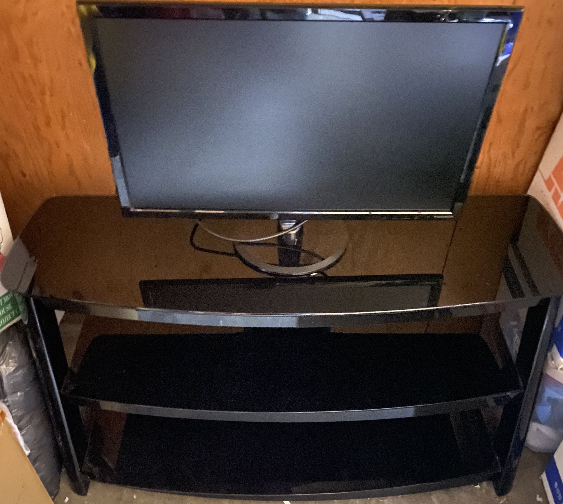 Black Glass and Metal TV stand. Like New! Excellent Condition! Originally bought from Best Buy. Fits 55” TV. TV not included. Please look at my other listings as well to see if there are other items you may be interested in.