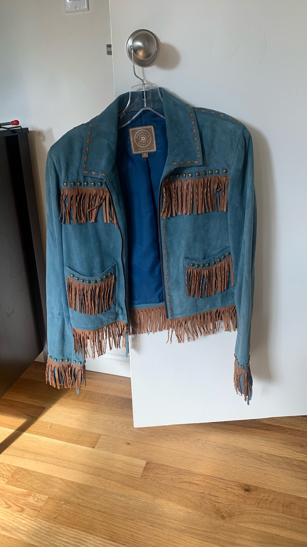 Blue jacket w brown fridge. Size smallZip up . So cute . The skirt is a size 4. Will sell separately if needed. Jacket $150. Skirt $100